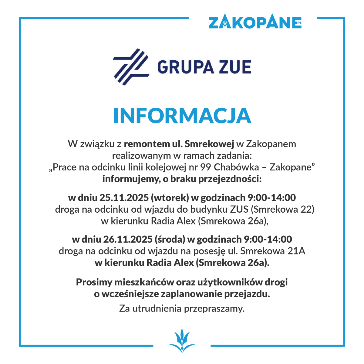 W związku z remontem ul. Smrekowej w Zakopanem realizowanym w ramach zadania: