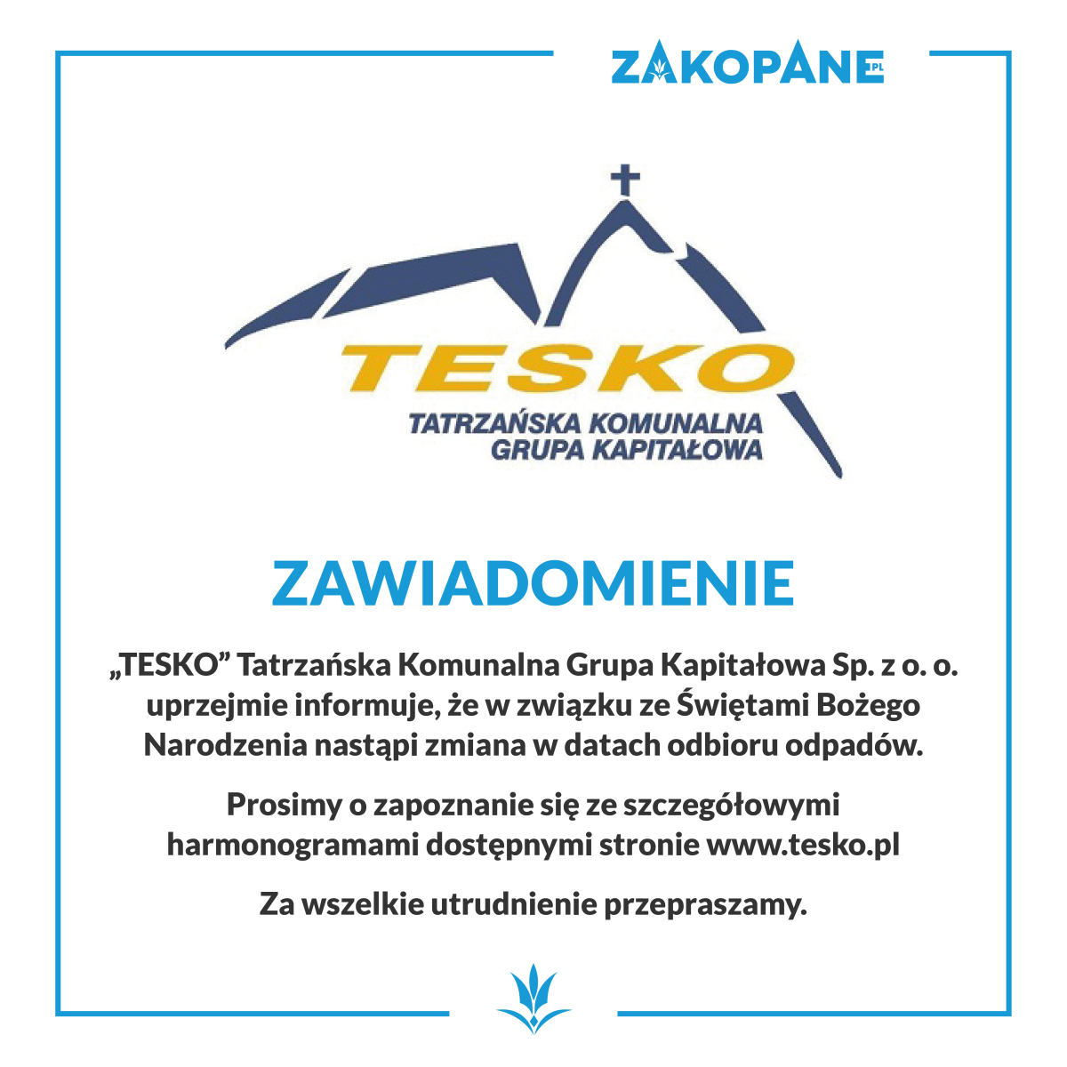 „TESKO” Tatrzańska Komunalna Grupa Kapitałowa Sp. z o. o. uprzejmie informuje, że w związku ze Świętami Bożego Narodzenia nastąpi zmiana w datach odbioru odpadów: