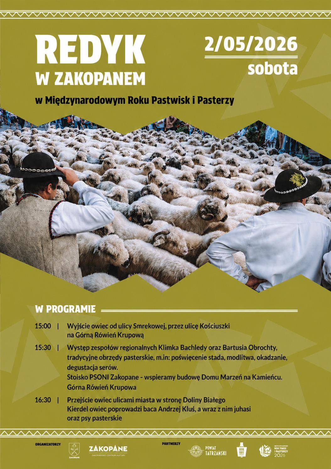 Tradycyjny redyk, prowadzony przez Bacę Klusia i jego juhasów przejdzie z ulicy Smrekowej, ulicą Kościuszki na Górną Rówień Krupową. Obok drewnianego napisu „Zakopane” będzie stał kosor, do którego wejdą owce i odbędą się tradycyjne obrzędy pasterskie (okadzanie stada, modlitwa, poświęcenie zwierząt i osób). Będzie można spróbować tradycyjnych serów, obejrzeć występy zespołów góralskich Małe Klimki oraz Bartusia Obrochty i posłuchać pasterskich przyśpiewek i gry na instrumentach pasterskich.